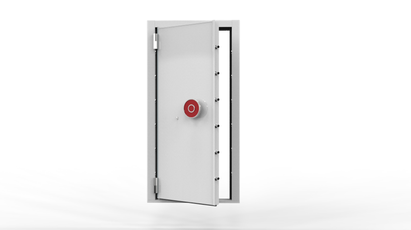 門扇內腔設置鎖栓傳動機構、進口組合密碼鎖、三鎖聯動裝置。防護層厚度120mm厚,其結構為:防護層為1.2mm不銹鋼+10mm鋼板+30mm防鉆板+32mm鋼筋混凝土+40mm防火層+4mm鋼板+2mm不銹鋼。具有防火、防腐、防鉆、防電弧功能。防護級別為人總行《金庫門JR/T0001-2000》標準:3級,抗強力破壞凈工作時間大于2小時。等同于公安部《金庫門通用技術條件GA/T143-1996》C級。